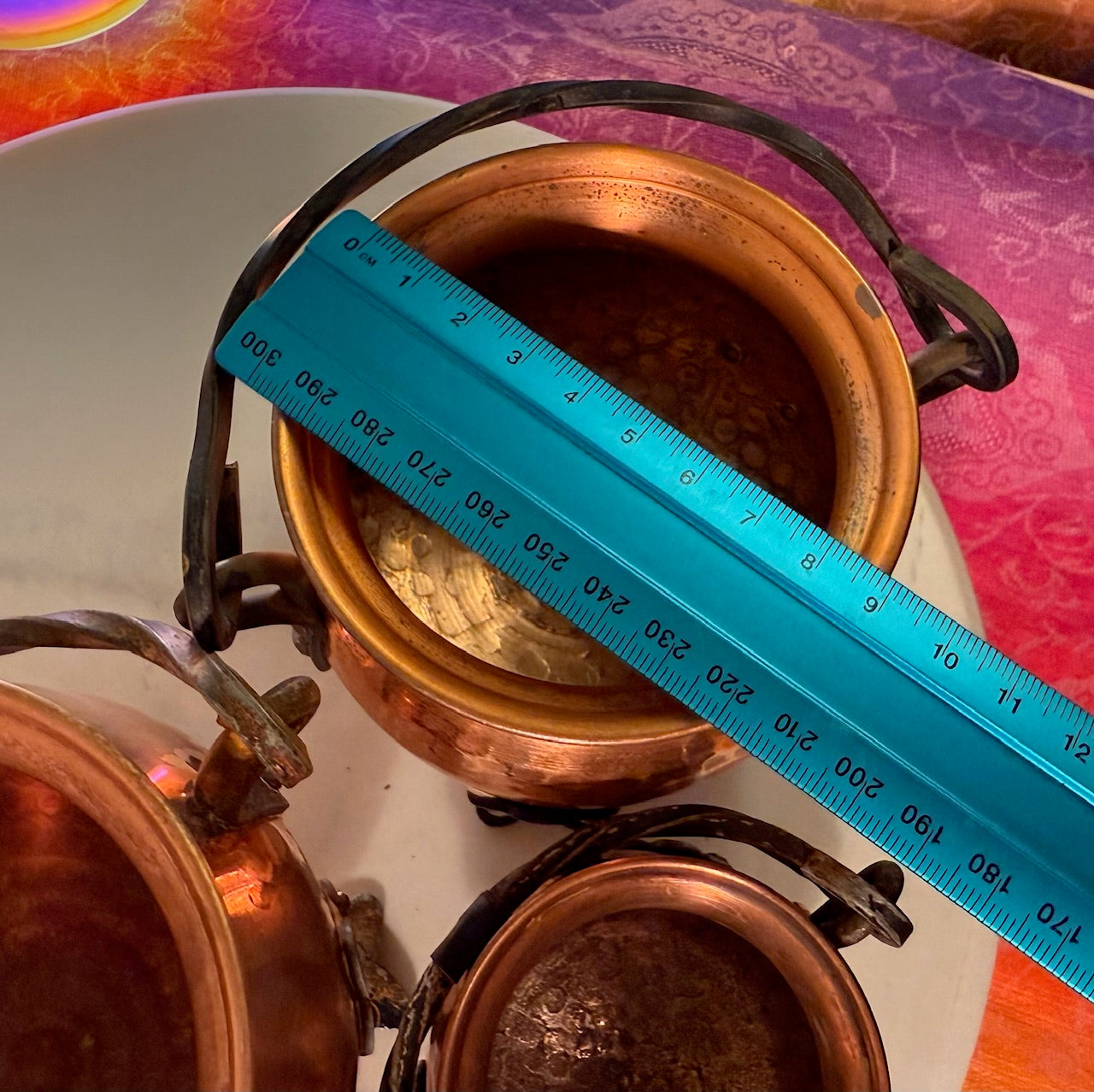 Forged in the old ways, this vintage copper cauldron carries the whisper of ancient hearths and the alchemy of fire and metal. Its warm copper body glows with a timeworn patina, while the sturdy cast iron handle speaks of strength, grounding, and endurance through the ages.